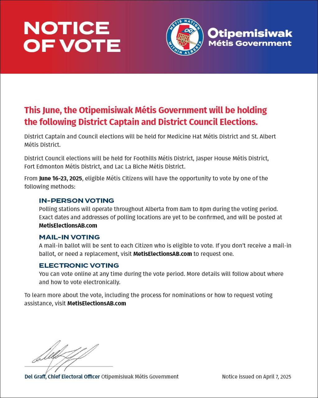 District Captain and Council elections will be held for Medicine Hat Métis District and St. Albert Métis District.
